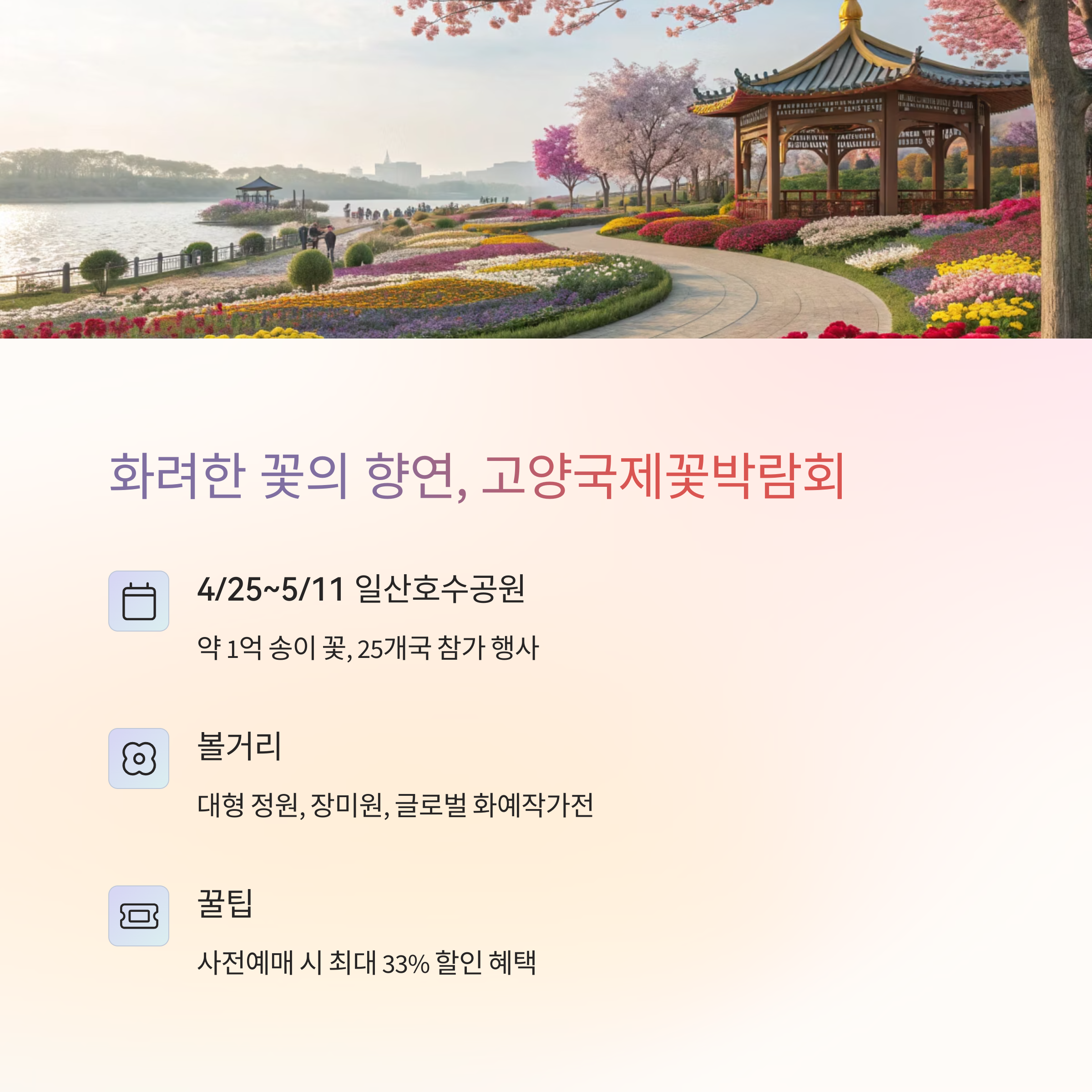 경기도 고양시 일산 호수공원에서 열리는 고양국제꽃박람회는 봄꽃의 절정을 가장 풍성하게 즐길 수 있는 국내 최대 꽃박람회입니다.