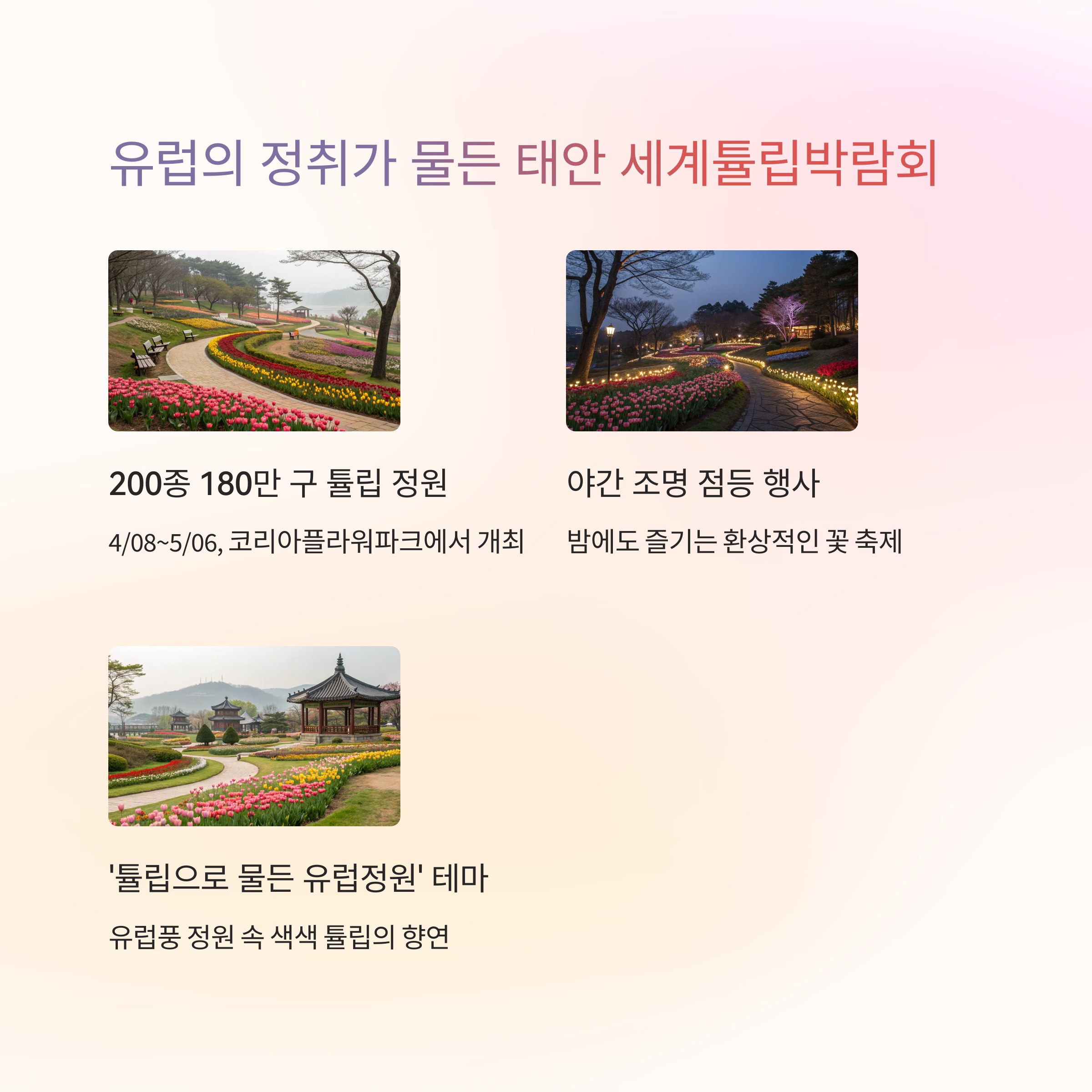 충남 태안 꽃지해안공원에서 펼쳐지는 세계튤립박람회는 국제튤립연맹이 선정한 세계 5대 튤립축제 중 하나입니다.