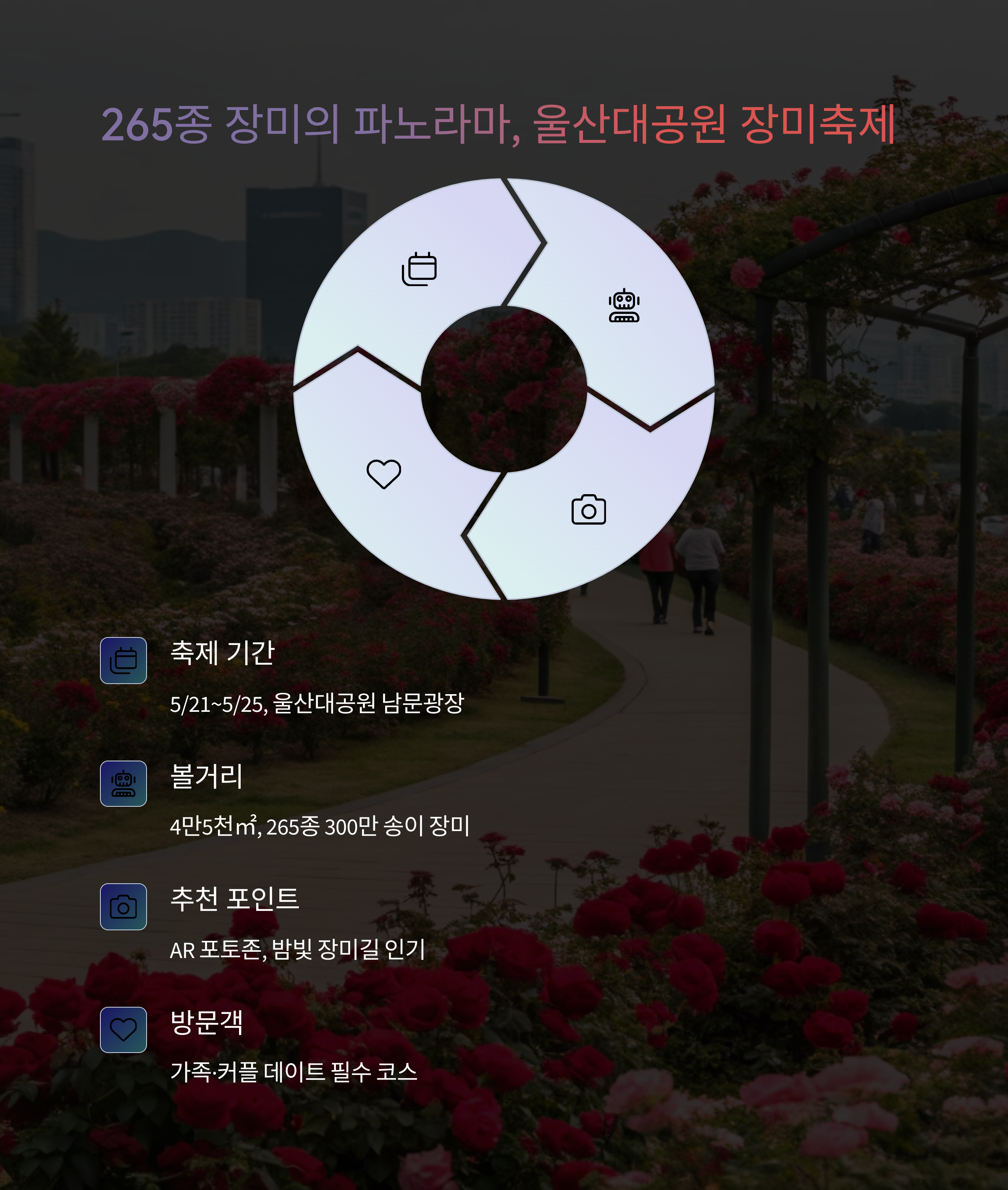 울산대공원의 장미축제는 매년 5월이 되면 도심 속에서 장미가 가장 아름답게 피어나는 시기를 알려줘요.