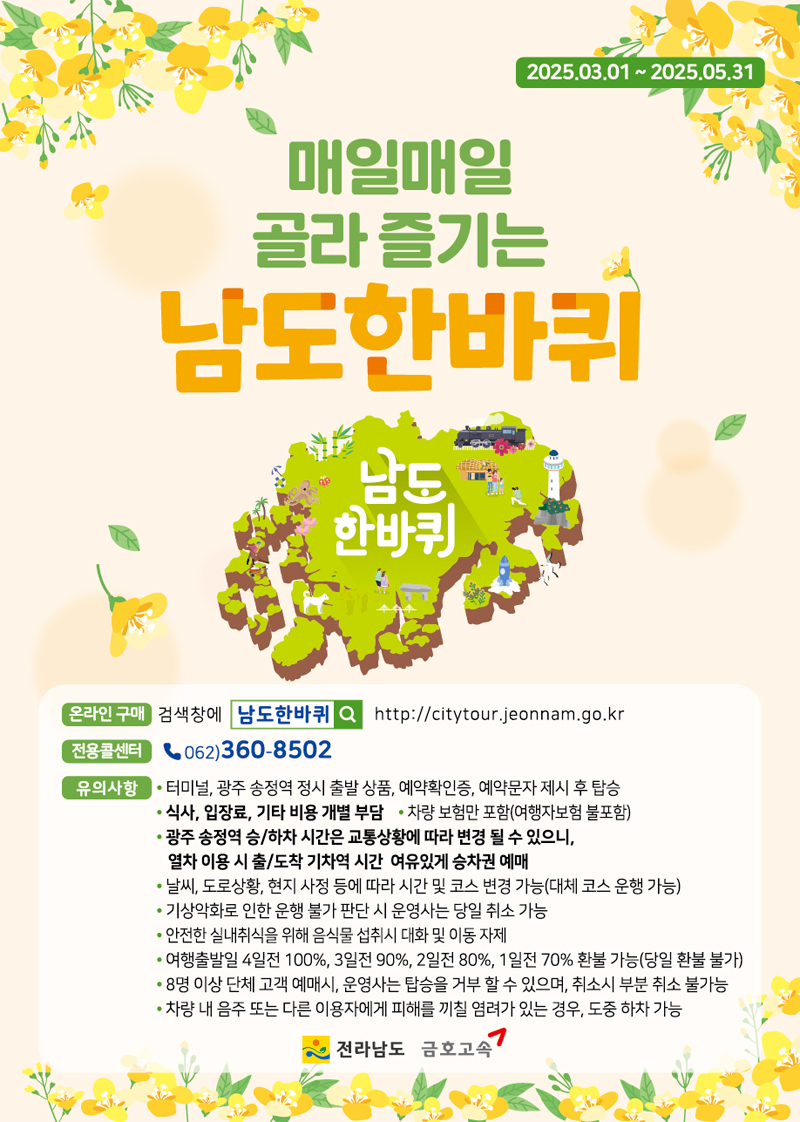 따뜻한 봄바람이 불어오면 어딘가로 훌쩍 떠나고 싶어지는 게 우리의 마음이죠.하지만 차가 없거나 먼 거리 운전이 부담될 때면 여행은 늘 머릿속 상상으로만 끝나기 쉽습니다.그런 분들에게 반가운 소식이 있어요.바로 전라남도가 운영하는 ‘남도한바퀴’ 순환형 버스 여행 프로그램입니다.하루 9,900원부터 시작되는 이 특별한 버스 여행은 전남의 명소를 누구나 쉽고 저렴하게 경험할 수 있게 도와줘요.광주와 순천을 출발점으로 구성된 총 21개의 테마 코스는 꽃이 만개한 봄 경치부터 바다, 섬, 전통시장, 문화유산, 맛집 탐방까지 폭넓게 구성돼 있습니다.특히 운전 걱정 없이 문화해설사의 설명을 들으며 하루 만에 여러 곳을 둘러볼 수 있다는 점에서, 여행 초보자나 부모님과의 가족 나들이, 우정 여행으로도 매우 좋은 선택지..